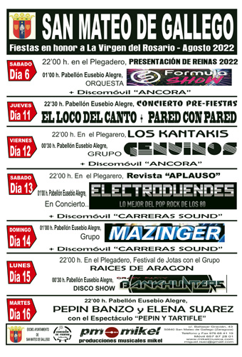 FIESTAS EN SAN MATEO DE GÁLLEGO Publicado el 3 agosto, 2022 por mikel música en Sin categoría Compártelo: Haz clic para compartir en X (Se abre en una ventana nueva) X Haz clic para compartir en Facebook (Se abre en una ventana nueva) Facebook Me gusta Cargando... Relacionado